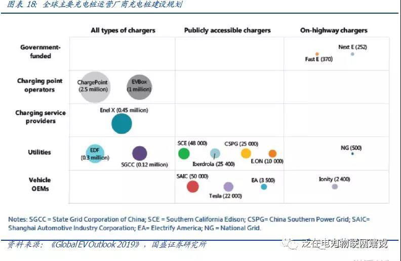 電力公司以公共服務為主,建設規(guī)劃中規(guī)中矩,各國電力公司如Enel(意大利國家電力公司)、EDF(法國電力集團)、SCE(南加州愛迪生電力公司)、Iberdrola(西班牙電力公司)、SGCC(中國國網)、SCPG(中國南網)、NG(英國國家電網)等均參與充電網運營布局。