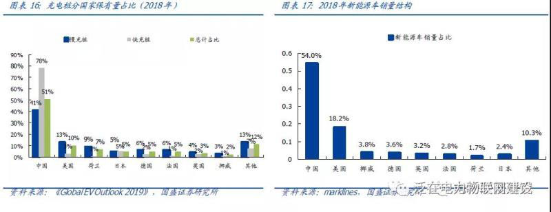 2018年末全球充電樁保有量約53.9萬個,其中中國最高,充電樁保有量占比約51%,快充樁比例更高,達78%;其次為美國,占比約10%,歐洲五國(荷蘭、德國、法國、英國、挪威)占比約22%;充電樁保有量分布與新能源汽車保有量較為一致。