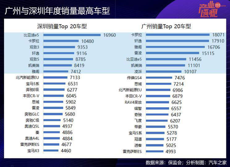 兩地熱銷車型方面,比亞迪e5作為出租車在深圳銷量第一,觀致的兩款車型進入到深圳銷量前五名。豐田卡羅拉和日產軒逸在廣州和深圳都是私家車熱選車型,在銷量排行榜上都很靠前。深圳市場豪華品牌車的整體銷量比廣州高,比如,寶馬2款、奔馳3款、奧迪2款進入深圳的熱銷車型Top 20榜單,而在廣州只有寶馬5系一款車進榜,且銷量沒有深圳多。另外,雷克薩斯ES都進入了兩地的熱銷車型榜,2019年,雷克薩斯銷量最高的城市就在廣州,第二大市場是上海,深圳是第三大區(qū)域市場,這三個城市的雷克薩斯銷量都超過了10000輛。
