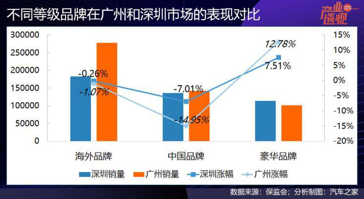 廣州和深圳2019年的GDP分別為2.4萬億元和2.7萬億元,屬于經濟發(fā)達地區(qū),豪華品牌車去年在兩地的銷量都有高幅增長,而中國品牌則同比下滑,在廣州的下滑幅度達到15%。深圳的汽車總保有量和千人保有量都高于廣州,2019年豪華品牌絕對銷量也比廣州高。