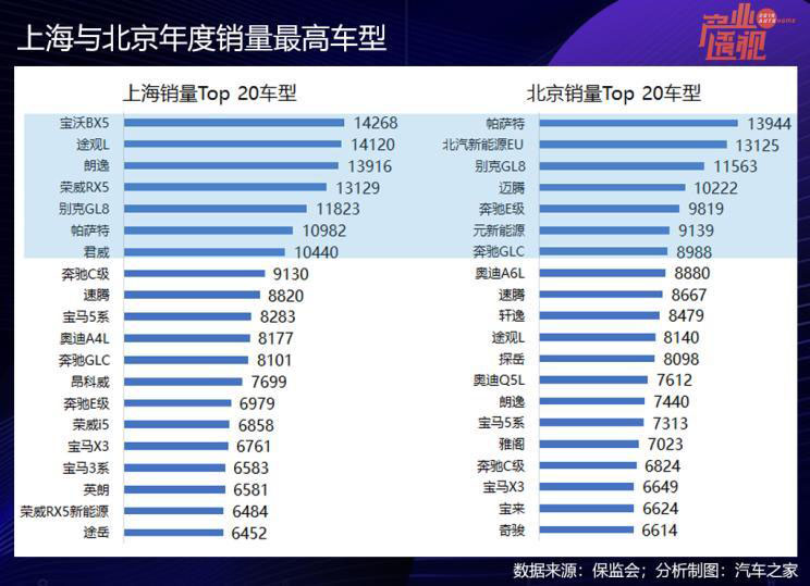 兩地的熱銷車型也差別明顯,比如,上海銷量最高的豪華品牌車型是中型轎車奔馳C級,而北京的是中大型轎車奔馳E級;奧迪A4L在上海銷量排第11位,而卻不在北京的Top 20車型榜上,反倒是中大型轎車奧迪A6L躋身于北京新車銷量榜第8位。比較詭異的是寶沃,寶沃工廠地處北京,卻在上海市場摘得頭牌。怎么做到的?以裙帶關系和一貫打法看,神州出行內部采購消納恐怕不在少數。