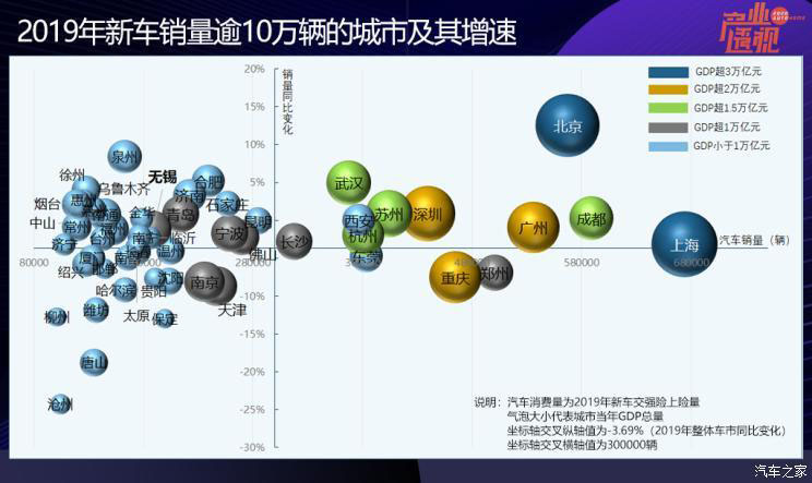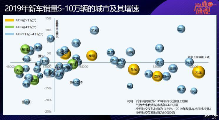 進一步放寬視野,去年銷量超過20萬輛的城市有24個,占當年全國新車總銷量的40%; 年銷量10萬輛以上的城市有53個,占同期全國的60%。這53個城市,就是國內汽車消費的“中堅力量”,也是各大品牌的兵家必爭之地,那么這些城市未來的增長空間在哪里?從下圖可見,整體而言,GDP規(guī)模較小的城市,新車銷量也較低,甚至銷量增速也受其影響。