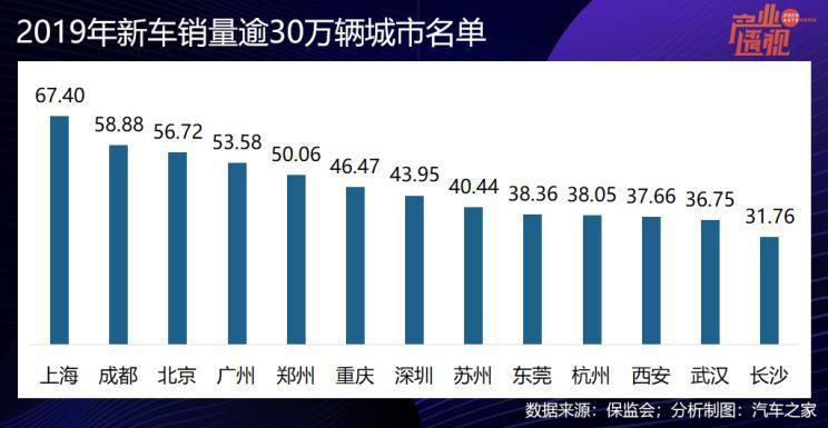 以2019年交強險上險數據看,國內城市汽車新車年消費量超過30萬輛的城市有13個,這13個城市的汽車消費600萬輛,占全國的27.7%。這里面除東莞和西安外,其他11個城市的GDP全部到達萬億級水平,上海和北京都超過了3萬億元,上海GDP最高(38155.32億元),新車銷量也最高(67.4萬輛),也是唯一一個新車銷量過60萬輛的城市。