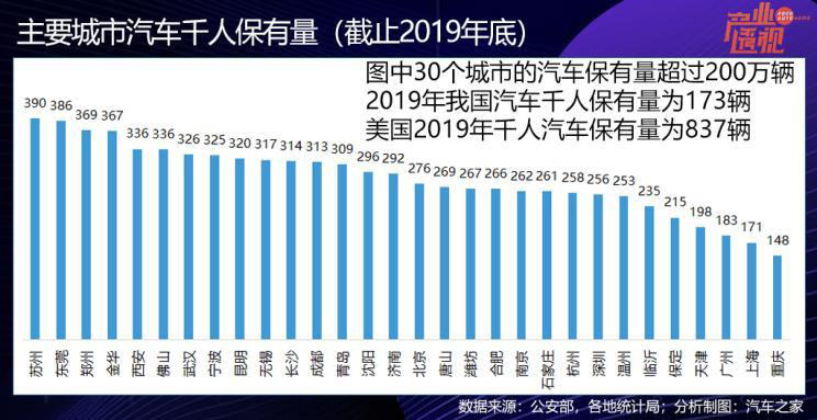 論及千人保有量(汽車保有量/常住人口),這30個汽車大城中最高的是蘇州,達到390輛,東莞與之接近,這兩個地方都是民營經濟較為發(fā)達的地區(qū)。上海和和重慶2019年的千人保有量不到全國平均水平,北京則高達到276輛。我國國情不同,不能簡單對標美國等地的千人保有水平,這30個城市中的大多數已經“苦擁堵久矣”,在基礎設施和交通治理水平得到根本改善之前,汽車的消費恐怕會以結構性替代為主、新增為輔。