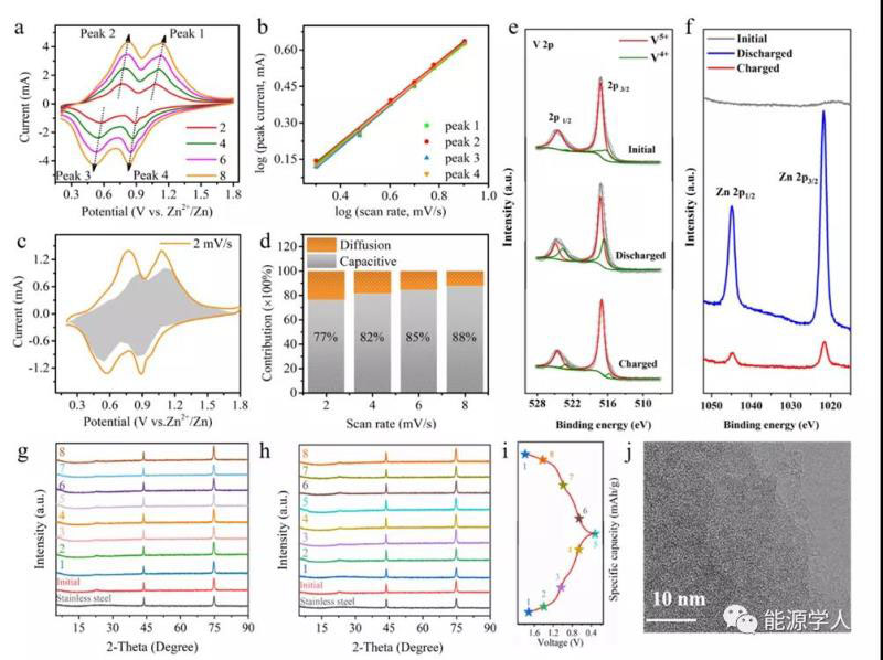 為進(jìn)一步了解該鋅離子電池的高性能特點(diǎn),作者進(jìn)行了動(dòng)力學(xué)的分析。如圖4a所示,在2-8 mV/s的掃描速率下,CV曲線表現(xiàn)出了和充放電曲線一致的氧化還原峰。據(jù)i=avb,峰1-4的b值分別為0.82,0.83,0.86和0.84(圖4b),說明其電容控制為主導(dǎo)的動(dòng)力學(xué)行為。此外,在2mV/s時(shí),電池容量77%來(lái)自于電容貢獻(xiàn)(圖4c),在4-8mV/s時(shí),電容貢獻(xiàn)分別為82%-88%(圖4d)。為進(jìn)一步證明鋅離子電池的工作原理,XPS(圖4e-f)和XRD(圖4g-i)揭示了其在充放電過程中的鋅離子脫出/嵌入的行為。同時(shí),HRTEM也證明了其在充放電過程中無(wú)定形結(jié)構(gòu)的特點(diǎn)。
