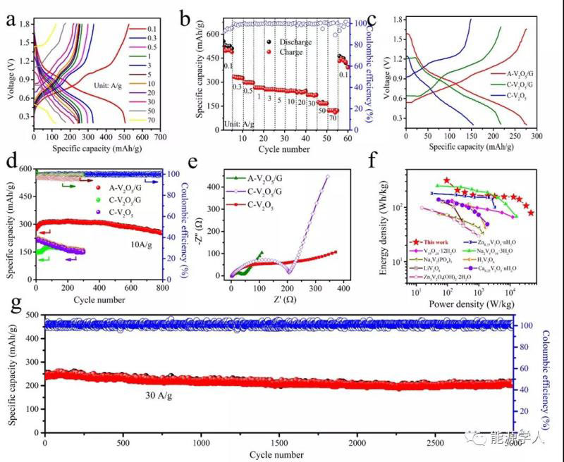 由于此二維異質(zhì)結(jié)有效耦合了高導(dǎo)電的石墨烯和無(wú)定形V2O5的優(yōu)點(diǎn),具有構(gòu)建高性能鋅離子電池的潛力。如圖3a所示,在0.1到70A/g的電流密度下,充放電曲線在1.0/0.8和0.6/0.5 V時(shí)有明顯的氧化還原峰,證實(shí)了兩電子傳輸?shù)臋C(jī)制。同時(shí),在0.1 A/g時(shí)表現(xiàn)出超高的容量489 mAh/g,超過了目前所有報(bào)道的釩基材料。在0.1,0.3,0.5,1,3,5,10,20,30,50和70 A/g的電流密度下,該電池分別表現(xiàn)出489,330,299,266,254,250,247,237,221,175和123 mAh/g的容量(圖3b)。作為對(duì)比,無(wú)定形V2O5異質(zhì)結(jié)(A-V2O5/GZIBs),晶型V2O5異質(zhì)結(jié)(C-V2O5/G ZIBs)和無(wú)石墨烯的晶型V2O5(C-V2O5 ZIBs)也被分別應(yīng)用于此鋅離子電池。圖3c所示,在10 A/g的電流密度下,A-V2O5/GZIBs具有276 mAh/g的高容量,而C-V2O5/GZIBs和C-V2O5 ZIBs只具有217 mAh/g和154 mAh/g的容量。同時(shí),800個(gè)充放電循環(huán)后,A-V2O5/GZIBs容量保持率有93%,而C-V2O5/GZIBs和C-V2O5 ZIBs在300個(gè)循環(huán)后只有68%和97%的容量保持率(圖3d)。據(jù)Ragone圖所示,該A-V2O5/GZIBs具有優(yōu)異的功率密度46 kW/kg和能量密度313Wh/kg(基于正極材料活性物質(zhì)質(zhì)量)。同時(shí),在30A/g下,循環(huán)3000圈后,容量保持率仍然高達(dá)87%。