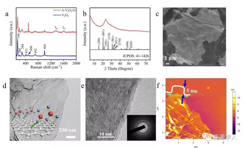 圖2. 二維異質(zhì)結(jié)材料(A-V2O5/G)的結(jié)構(gòu)表征。(a) Raman圖;(b)XRD圖;(c)SEM圖;(d)TEM圖,插圖為表面離子吸附方式;(e)HRTEM圖,插圖為相應(yīng)的SAED圖;(f)AFM圖和相應(yīng)的厚度。