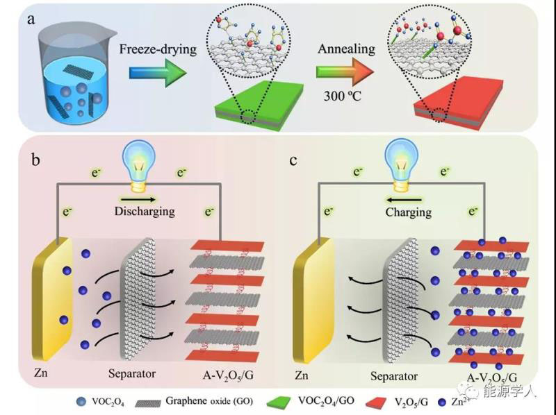 利用一種二維氧化石墨烯模板離子吸附的策略,作者可控制備出基于石墨烯和無(wú)定形V2O5的二維異質(zhì)結(jié)材料。合成方法如圖1a 所示。以VOC2O4為前驅(qū)體,利用離子吸附的方式吸附于氧化石墨烯表面,形成三明治型的前驅(qū)體。通過退火處理,得到無(wú)定形V2O5和石墨烯的超薄二維異質(zhì)結(jié),并將其作為正極材料,構(gòu)建了鋅離子電池,工作原理如圖1b,c所示。