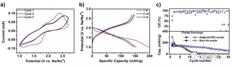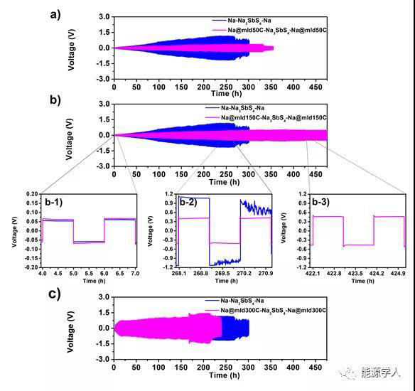 圖2 a)不同MLD沉積參數(shù)下得到的alucone薄膜在Na-Na對稱電池中的表現(xiàn)。沉積圈數(shù)分別為a)50;b)150;c)300。藍(lán)色譜線為無alucone保護(hù)的Na-Na對稱電池循環(huán)圖。