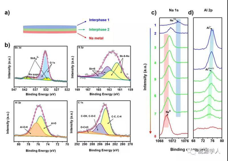 進(jìn)一步地,研究者借助深度分布的XPS呈現(xiàn)了界面元素化學(xué)態(tài)的分布。最表層的Na 1s和Al 2p的峰對應(yīng)于Na1+和Al3+,這表明界面最表層的成分是alucone以及Na3SbS4電解質(zhì),XPS譜圖同時(shí)也證明了該表層中Na3SbS4電解質(zhì)保持穩(wěn)定,未發(fā)生任何分解。隨著探測深度增加,Na和Al的特征峰同時(shí)向著低結(jié)合能的位置偏移,說明alucone被逐步鈉化形成了Na-Al-C-O結(jié)構(gòu),該結(jié)構(gòu)有助于鈉離子在界面處擴(kuò)散,對抑制枝晶生長也起到了助力作用。最后,Al的信號在偏移過程中逐漸減弱至消失,而Na的信號則逐步增強(qiáng)且偏移至1070 eV,即到達(dá)鈉金屬層。XPS和ToF-SIMS深度分布結(jié)果一致,證明了被鈉化的alucone和alucone本身對界面保護(hù)起到了協(xié)同作用,共同抑制了界面反應(yīng)的產(chǎn)生和鈉枝晶的生長。