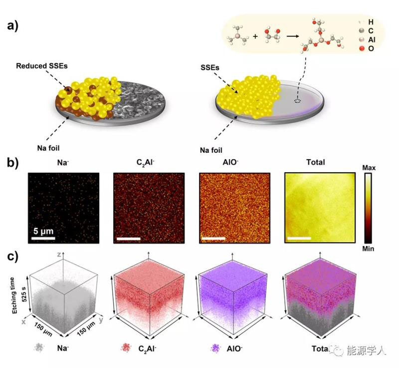 圖1 a)示意圖對比了在有和無alucone保護(hù)時(shí)鈉金屬/硫化物界面;b) Cs+連續(xù)濺射前Na@alucone負(fù)極的ToF-SIMS二次離子圖像;c) ToF-SIMS深度掃描三維影像模型