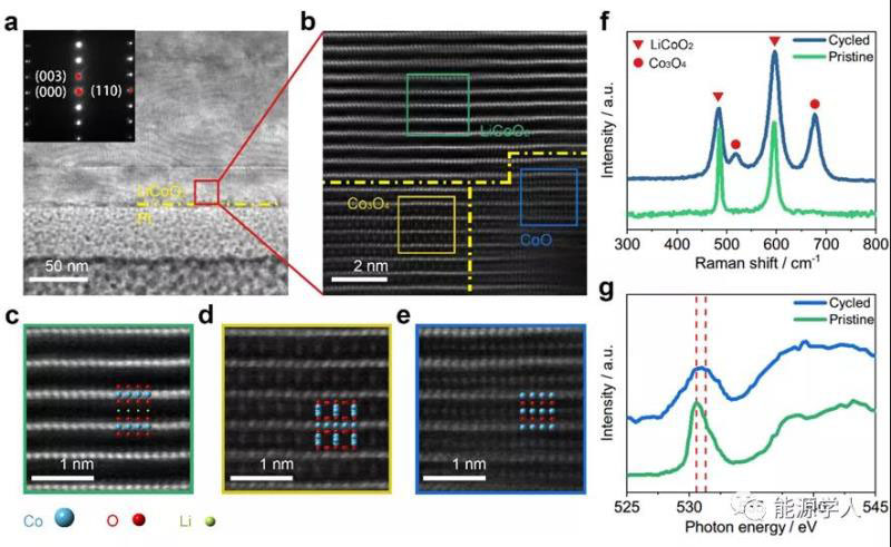 圖4 LiCoO2表面結(jié)構(gòu)與成分表征。(a-e)電池失效后鈷酸鋰顆粒的TEM表征,(a)明場(chǎng)像;(b)表面區(qū)域的暗場(chǎng)像;(c-e)圖b中標(biāo)記位置的放大圖像。以及原始極片與失效后極片的(f)拉曼和(g)XAS表征。