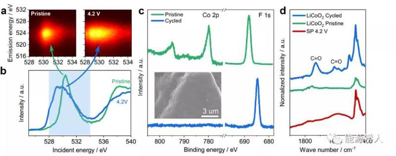 圖3 原始鈷酸鋰和4.2V充電態(tài)鈷酸鋰的(a)RIXS和(b)XAS表征;(c)循環(huán)前后電極表面的XPS(插圖為失效后電極表面形貌)和(d)紅外光譜對(duì)比。其中SP電極為4.2V恒壓48小時(shí)后的表征結(jié)果。