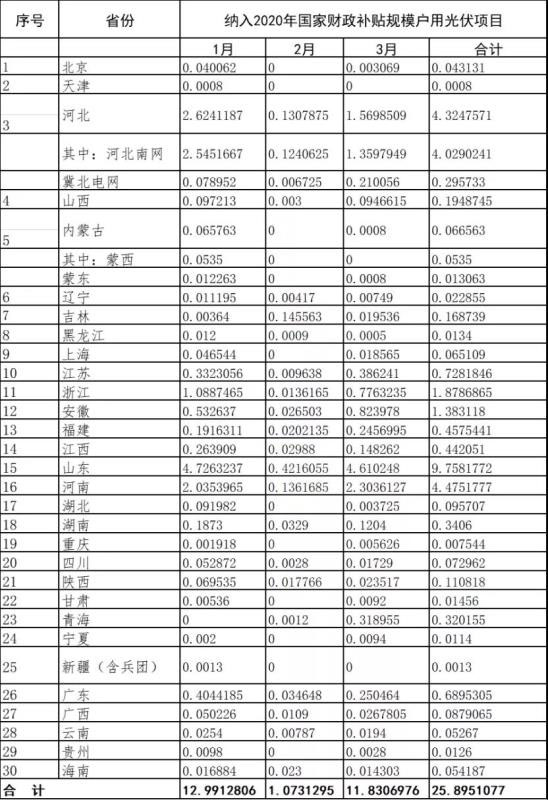 2020年4月15日,能源局官網(wǎng)發(fā)布了納入2020年一季度國(guó)家財(cái)政補(bǔ)貼規(guī)模戶用光伏項(xiàng)目裝機(jī)容量統(tǒng)計(jì)名單。