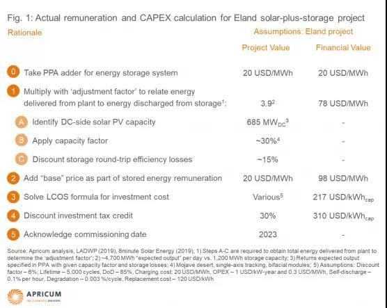 第四步,需要考慮投資稅收抵免(ITC)的部分,以計入任何對投資成本的補貼。在美國,ITC最初是對太陽能的一項財政激勵措施,但它也適用于存儲光伏電站所發(fā)電量的儲能系統(tǒng)。8minuteSolar Energy在2019年開始為Eland光儲項目建設(shè)了一個變電站,所以它仍可以獲得30%的ITC(2020年,補貼比例將退坡至26%),這大大降低了儲能系統(tǒng)的有效資本支出。考慮到這一激勵因素,項目最終的資本支出為310美元/kWhcap。