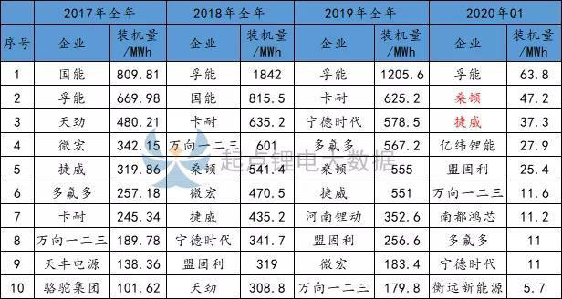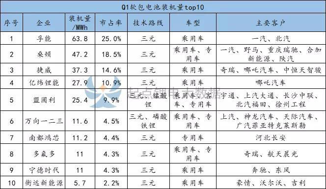 據(jù)起點鋰電大數(shù)據(jù)統(tǒng)計,Q1實現(xiàn)軟包電池裝機的企業(yè)共有20家,排名前十的企業(yè)分別是孚能、桑頓、捷威、億緯鋰能、盟固利、萬向一二三、南都鴻芯、多氟多、寧德時代和衡遠新能源,10家企業(yè)合計裝機量合計占比98.6%。