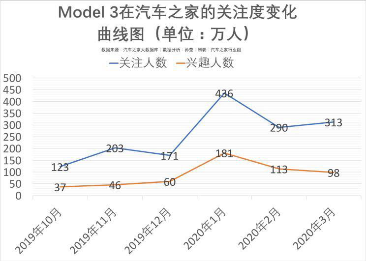 在汽車之家大數(shù)據(jù)庫中,一組數(shù)據(jù)更能說明問題。從2019年第四季度到2020年第一季度,Model 3的關(guān)注人數(shù)始終居高不下,今年1月Model 3正式在上海工廠量產(chǎn)下線,彼時的關(guān)注人數(shù)更是飆升至436萬人。而此前號稱對標(biāo)Model 3的Polestar 2與小鵬P7,同時期的關(guān)注人數(shù)僅為數(shù)萬人,差距懸殊。