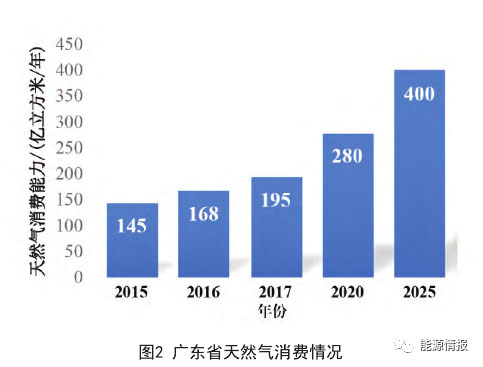 (2)分布式能源和6F 燃機(jī)將是廣東省新增氣電主體。當(dāng)前廣東省各地市擬規(guī)劃新增的天然氣發(fā)電項(xiàng)目主要是分布式能源項(xiàng)目和6F 機(jī)組,未來(lái)這將是廣東省電力行業(yè)新增天然氣需求的重要載體。廣東省天然氣消費(fèi)情況如圖2所示,到2020年,天然氣消費(fèi)量比2015年翻一番,比重達(dá)到一次能源的11%,到2025年將預(yù)計(jì)達(dá)到15%。