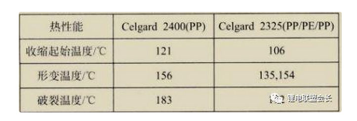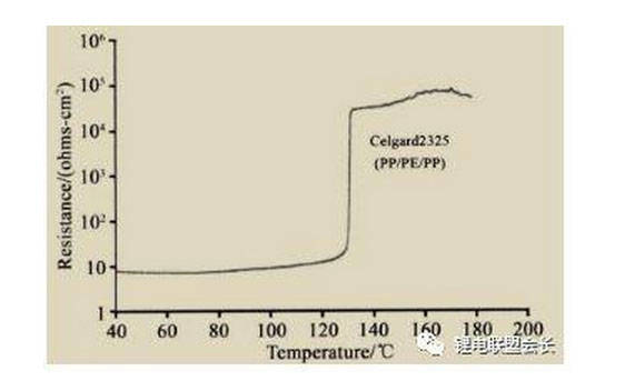 例如,單層PP膜的熔融 裂溫度比單層PE膜高約30℃,三層PP/PE/PP復(fù)合膜的閉孔 度和單層PE膜接近而熔融破裂溫度卻與單層PP膜相近,表明三層復(fù)合隔膜在較低的溫度下閉孔后仍有30℃左右的溫度范圍保持較高的電阻,從而保證電池的安全。