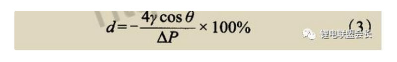 ③根據(jù)在單一孔道中的液體完全由毛細(xì)孔道內(nèi)擠出時(shí)所施壓力與孔道直徑的相對關(guān)系,依照Laplace方程可得隔膜孔徑,Laplace方程如式(3)所示。