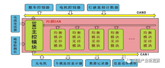 動力電池BMS一端與電池相連,另一端又與整車的控制及電子系統(tǒng)相連接,BMS通過CAN總線接口與車載總控制器、電機控制器、能量控制系統(tǒng)、車載顯示系統(tǒng)等進行實時通訊。