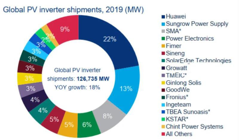 近日,能源調(diào)研機(jī)構(gòu)Wood Mackenzie發(fā)布了《全球太陽(yáng)能光伏逆變器市場(chǎng):2020年市場(chǎng)份額和出貨量趨勢(shì)報(bào)告》,2019年全球逆變器的出貨量為126.735GW,同比增長(zhǎng)18%。各品牌占比如下圖所示。
