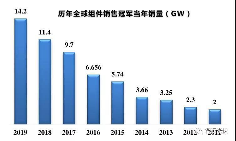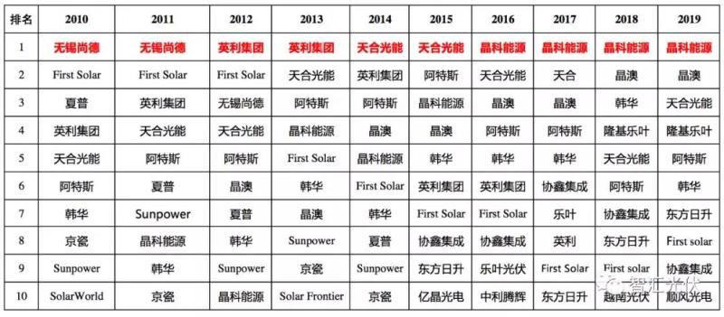 最近十年(2010~2019年)的光伏組件出貨量排名如下表所示。