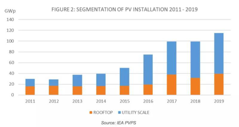 2019年,全球光伏裝機(jī)值為114.9GW,累計(jì)裝機(jī)達(dá)到了627GW。