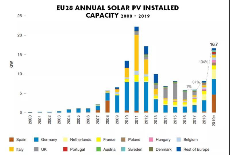 海外市場(chǎng)則從2018年的58.8GW提高到了2019年的84.9GW,增長(zhǎng)幅度為44%。其中,歐盟裝機(jī)接近16GW,歐洲其余地區(qū)約為5GW。