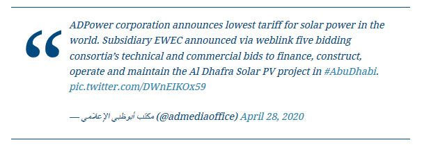 4月28日,隨著下面這條推文的發(fā)布,阿聯(lián)酋政府的媒體宣布,阿聯(lián)酋水電公司(EWEC)去年7月啟動的1.5GW光伏發(fā)電招標(biāo),獲得了世界最低的太陽能發(fā)電價格。