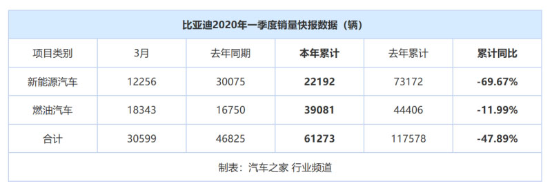 比亞迪表示,2020年第一季度,新冠疫情及宏觀經(jīng)濟(jì)下行對(duì)汽車行業(yè)整體市場(chǎng)需求沖擊較大,公司新能源汽車銷量較去年同期有較大幅度下滑。一季度,比亞迪累計(jì)銷量為61273輛,同比降低47.89%。相對(duì)而言,新能源車銷量下滑更為明顯,一季度共銷售22192輛,同比下降-69.67%;燃油車一季度銷售39081輛,同比下降11.99%。