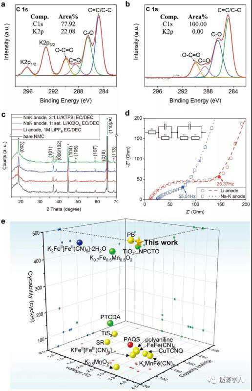 圖5. 在0.1C循環(huán)后,NMC/Na-K電池負(fù)極(a)和正極(b)的XPS結(jié)果;(c) NMC、Li和Na-K在不同條件下的XRD圖譜;(d) NMC/Na-K電池和NMC/Li電池的阻抗譜;(e)鉀離子電池性能的比較