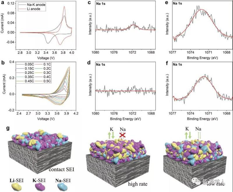 圖4. (a) NMC/Na-K電池和NMC/Li電池在0.05C下的CV曲線,(b)NMC/Na-K電池在不同倍率下的CV曲線,(c–f)Na-K負(fù)極上形成的SEI的XPS結(jié)果,(g)不同倍率下不同SEI組分的示意圖