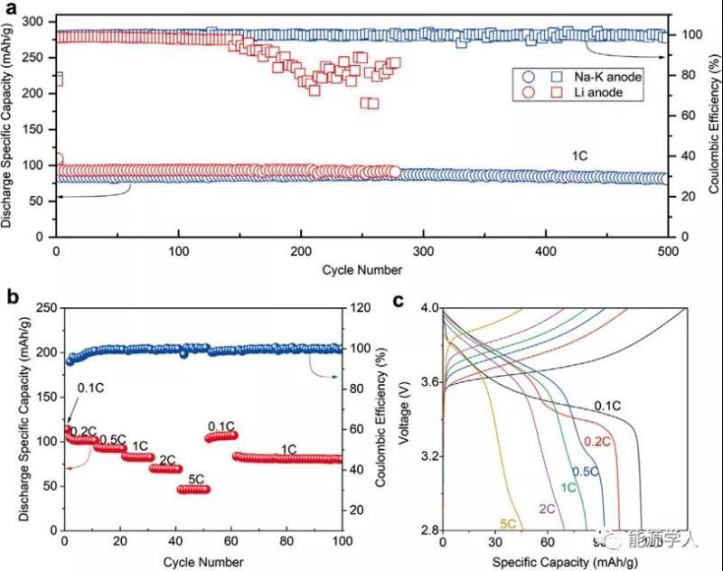 通過(guò)使用無(wú)枝晶的LM,NMC/Na-K混合陽(yáng)離子電池在恒電流充放電測(cè)試中表現(xiàn)出了優(yōu)異的電化學(xué)性能(圖3)。結(jié)果表明,經(jīng)過(guò)150次循環(huán)后,Li負(fù)極開(kāi)始不穩(wěn)定,庫(kù)侖效率大幅降低,而Na-K負(fù)極與NMC正極能夠穩(wěn)定循環(huán)至少500次。NMC/Na-K混合電池的容量可與鋰媲美,如圖3a所示,在1C (1C=150 mA g?1)下經(jīng)過(guò)250次循環(huán)后,比鋰負(fù)極更穩(wěn)定。通過(guò)計(jì)算,每個(gè)循環(huán)的容量保持率為99.998%。這種全電池的倍率性能也與鋰金屬電池相當(dāng),其中5C倍率的容量約為1C倍率的一半。與鋰電池相比,Na-K電池的電壓-容量曲線(圖3c)顯示出明顯的差異,即電壓平臺(tái)與Li的對(duì)應(yīng)關(guān)系不佳,并且不同倍率的平臺(tái)位置也表現(xiàn)出差異。