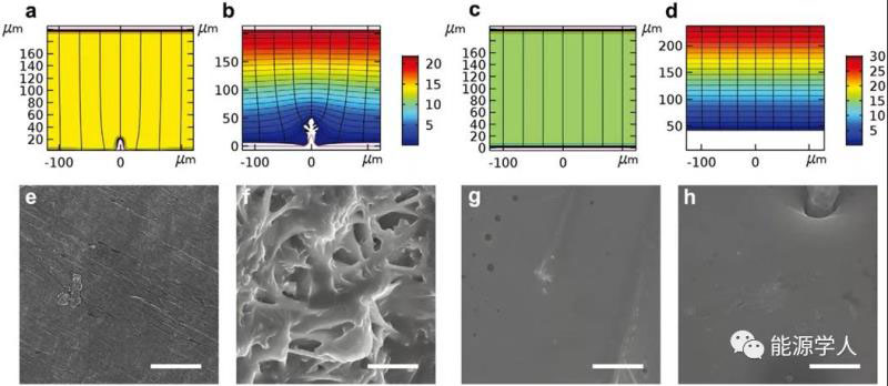 圖2. Li金屬(a,b)和Na-K合金(c,d)負(fù)極在原始(a,c)和還原(b,d)狀態(tài)下沉積的COMSOL多物理場(chǎng)模擬結(jié)果;Li對(duì)稱電池在循環(huán)前(e)后(f) Li表面和Na-K對(duì)稱電池在循環(huán)前(g)后(h) Na-K表面的SEM圖像
