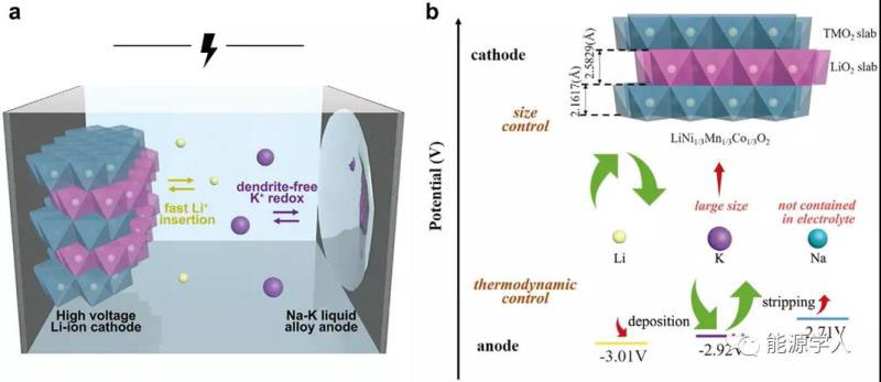 式中,E為反應(yīng)電勢(shì),F(xiàn)為法拉常數(shù),n為電荷轉(zhuǎn)移數(shù)。如圖1b所示,在放電過(guò)程中,K+在Na+之前被氧化(?2.92 V<?2.71 V),而在充電過(guò)程中,K+在Li+之前被沉積(?2.92 V>?3.01 V)。對(duì)于正極,TMO2層和LiO2層交替堆疊,構(gòu)建了LiNi1/3Mn1/3Co1/3O2晶體,其中LiO2層的層間距為2.58 ?。Li+、Na+和K+的半徑分別為0.76、1.02和1.38 ?。由于沒(méi)有向電解液中添加鈉鹽,并且K+比正極中的Li+嵌入通道大(2.76 ?>2.58 ?),因此K+無(wú)法嵌入鋰中,從而實(shí)現(xiàn)了對(duì)Li+插層的控制??傮w而言,整個(gè)電化學(xué)過(guò)程可根據(jù)負(fù)極和正極的熱力學(xué)偏好和尺寸限制進(jìn)行調(diào)整,使無(wú)枝晶的LM電極和穩(wěn)定的鋰離子正極結(jié)合,這有望實(shí)現(xiàn)高容量。