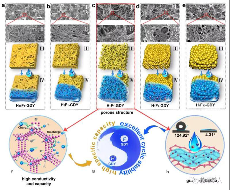 圖4. HxFy-GDY形貌演變示意圖(a-e)HxFy-GDY形貌演變及界面浸潤性示意圖(f-h)H1F1-GDY的儲(chǔ)鋰優(yōu)勢。