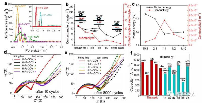 圖3. HxFy-GDY的性能對(duì)比(a-c)孔徑分布,接觸角測試,電導(dǎo)率及光學(xué)帶隙匯總圖(d-e)循環(huán)不同圈數(shù)后的阻抗分析(f)100 mA/g 下HxFy-GDY的儲(chǔ)鋰容量與報(bào)道文獻(xiàn)對(duì)比圖。