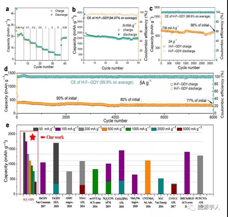 在50 mA/g的電流密度下,半電池測試H1F1-GDY能夠達(dá)到2050 mA h/g的高比容量。運(yùn)行50圈的平均庫倫效率為94.07%,這是因?yàn)椴糠稚疃惹度氲匿囋谶_(dá)到高容量后沒有完全脫嵌,但這并不影響在大電流下長期循環(huán)的穩(wěn)定性。在2 A/g和5 A/g下庫倫效率平均為99.9%,在原文中,通過EIS, In-situ FT-IR 以及循環(huán)后電極的XPS分析,明確了材料良好界面性質(zhì)形成的穩(wěn)定SEI膜。對(duì)比近些年報(bào)道的優(yōu)秀儲(chǔ)鋰負(fù)極材料,H1F1-GDY的比容量及穩(wěn)定性都更為優(yōu)異。