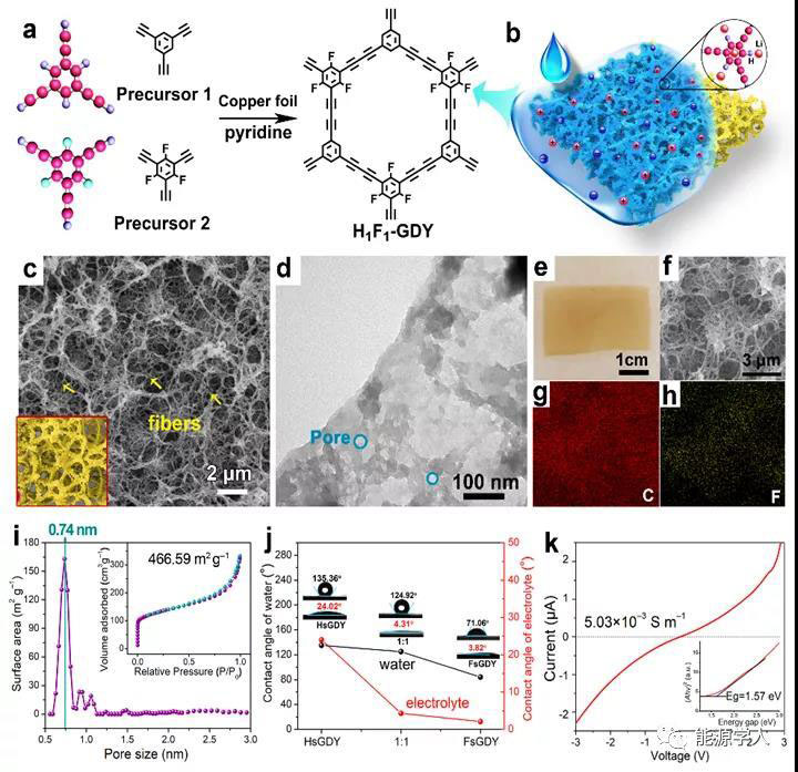 在該工作中,通過改變偶聯(lián)前體,自下而上制備了H1F1-GDY。由于元素的定位取代,結(jié)構(gòu)中大量含有的是42-C的六邊形大環(huán)。利用FT-IR,XPS,Raman,EDS等表征了材料中H/F的比例及分布,并測試了材料的部分物理性質(zhì)。如圖1所示,材料具有纖維交織的連續(xù)多孔結(jié)構(gòu),元素面掃譜圖顯示F元素均勻分布于結(jié)構(gòu)中。孔徑分析顯示材料具有相對(duì)單一的主孔分布,對(duì)應(yīng)單一的AB堆積形式。另外,得益于粗糙的界面形貌及F元素?fù)诫s,材料顯示出優(yōu)異的電解液浸潤性。通過I-V曲線分析,測得材料的導(dǎo)電性約為GDY的20倍。結(jié)果表明,材料實(shí)現(xiàn)了孔結(jié)構(gòu)、浸潤性及導(dǎo)電性三種物理化學(xué)性質(zhì)的協(xié)同優(yōu)化。