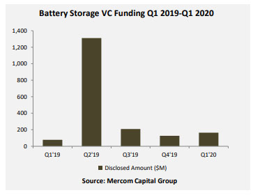 根據(jù)Mercom Capital Group最新融資并購報(bào)告“Battery Storage,SmartGrid,and Efficiency Funding and M&A”的數(shù)據(jù)顯示,2020年一季度,全球電池儲(chǔ)能領(lǐng)域的融資總額達(dá)2.44億美元,較2019年一季度有大幅增長,同比增長88%。其中,風(fēng)險(xiǎn)投資共計(jì)1.64億美元,同比2019年一季度增長110%,環(huán)比2019年四季度增長30%。