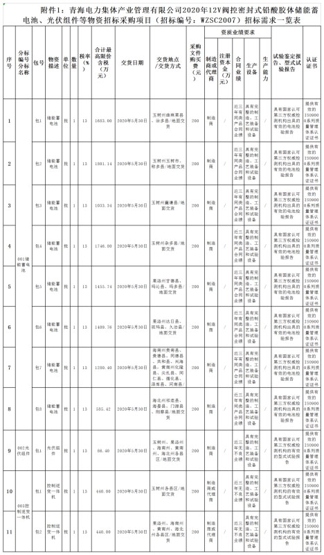 青海電力集體產(chǎn)業(yè)管理有限公司2020年12V閥控密封式鉛酸膠體儲(chǔ)能蓄電池、光伏組件等物資招標(biāo)采購項(xiàng)目招標(biāo)公告