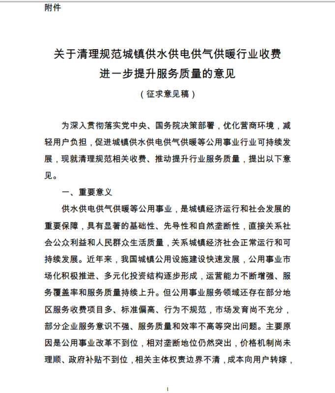 附件: 關(guān)于清理規(guī)范城鎮(zhèn)供水供電供氣供暖行業(yè)收費(fèi)進(jìn)一步提升服務(wù)質(zhì)量的意見(征求意見稿)