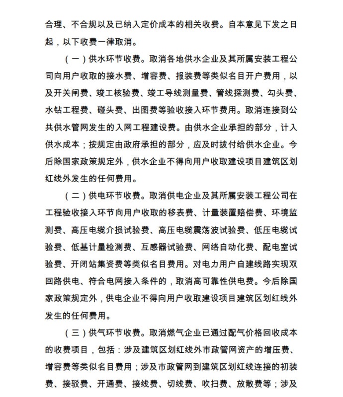 取消供電企業(yè)及其所屬安裝工程公司在工程驗(yàn)收接入環(huán)節(jié)向用戶收取的移表費(fèi)、計(jì)量裝置賠償費(fèi)、環(huán)境監(jiān)測(cè)費(fèi)、高壓電纜介損試驗(yàn)費(fèi)、高壓電纜震蕩波試驗(yàn)費(fèi)、低壓電纜試驗(yàn)費(fèi)、低基計(jì)量檢測(cè)費(fèi)、互感器試驗(yàn)費(fèi)、網(wǎng)絡(luò)自動(dòng)化費(fèi)、配電室試驗(yàn)費(fèi)、開閉站集資費(fèi)等類似名目費(fèi)用。對(duì)電力用戶自建線路實(shí)現(xiàn)雙回路供電、符合電網(wǎng)接入條件的,取消高可靠性供電費(fèi)。今后除國(guó)家政策規(guī)定外,供電企業(yè)不得向用戶收取建設(shè)項(xiàng)目建筑區(qū)劃紅線外發(fā)生的任何費(fèi)用。