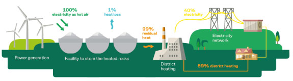 其原理就像一個大型燒烤架,其熱儲能設(shè)施由一堆絕熱的石頭組成,由風力渦輪機的剩余電力提供能量、將熱量吹到大量石頭上將石頭加熱到600℃,當再次需要能量時,將石頭儲存的熱量再排放出來,通過水蒸氣驅(qū)動發(fā)電機產(chǎn)生電力,余熱供給區(qū)域供熱。
