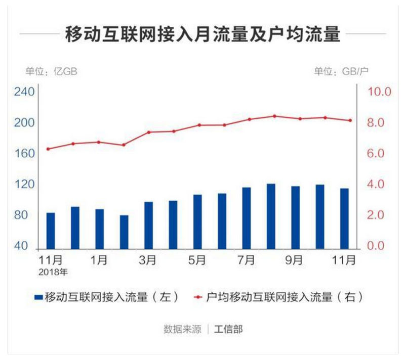 在“流量紅利”和“提速降費”雙重加持下,4G用戶DOU(平均每個用戶每月使用的上網(wǎng)流量)提高了7倍以上。