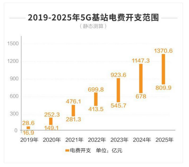 如果按照到第7年時基站功耗降低了20%來算,則當(dāng)年5G基站的電費開支為647.9億~1096.5億,取中間值約為872.2億。