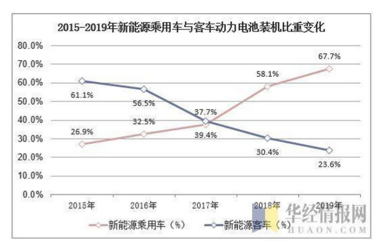 近年來新能源乘用車動力電池裝機(jī)量比重逐漸崛起,伴隨著國內(nèi)新能源乘用車紛紛實(shí)現(xiàn)量產(chǎn)交付,2018年中國新能源乘用車動力電池裝機(jī)量反超客車動力電池裝機(jī)量,達(dá)34.33GWh,占比58.1%,至2019年新能源乘用車動力電池裝機(jī)量占比達(dá)67.7%,同比2018年提升了9.6個(gè)百分點(diǎn)。