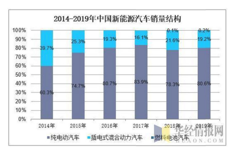 從動力結(jié)構(gòu)來看,純電動汽車是拉動新能源汽車發(fā)展的主要?jiǎng)恿Γ?019年純電動汽車銷售量約為97.2萬輛,占新能源汽車銷售總量的80.6%;插電式混合動力汽車銷量約為23.2萬輛,占比19.2%;燃料電池汽車銷量2737輛,占比0.2%。