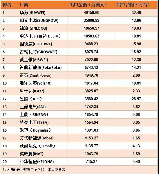 詳細的逆變器企業(yè)出口金額及出口數量如下表所示:
